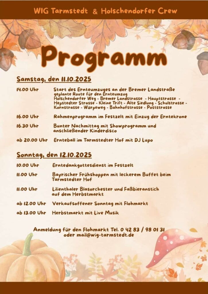 Wir freuen uns auf die zweitägige Veranstaltung der „Holschendorfer Crew“ und der Wirtschafts-Interessen-Gemeinschaft Tarmstedt mit dem Ernteumzug und dem Ernteball am Samstag sowie einem verkaufsoffenem Sonntag ab 12.00 bis 17 Uhr.